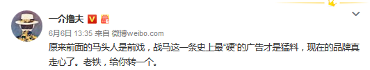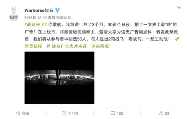 同滴滴快车一样,战马的目标人群也是年轻人,品牌从创立开始便确定了“主动战”的品牌理念,而要把这个为年轻人打造的品牌让年轻人看到并接受,显然传统TVC广告的投放并没有引起战马的兴趣,互联网时代,品牌营销的一切打法都必须出奇制胜,才能在愈发激烈的竞争中脱颖而出,战马也很快地参悟到了这一点,摒弃了传统TVC广告单向传播的方式,结合目标群体的行为特点,同滴滴快车一样打起了社会化营销这张牌,与目标群体深度互动和沟通,在预热期和引爆期通过微信微博、网络红人、KOL转发等一系列组合,配合悬念十足的“马头人”落地品牌活动,将TVC发布一步步推向高峰,而最后,联合全新出道的CORE ONE乐团同时推出品牌代言人和终极版TVC,配合马头人最终揭面,悬念解开,整个TVC营销犹如一出大戏,跌宕起伏,有悬念有解谜,倍感新鲜,而且从网络数据来看,最终取得了很好的传播效果。