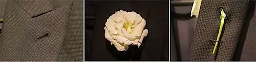 一套考究的衣服,不仅在左胸前会有插花眼,驳头的背面还会有一条线,专门用来固定花朵: