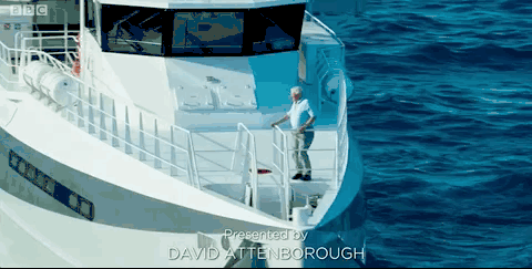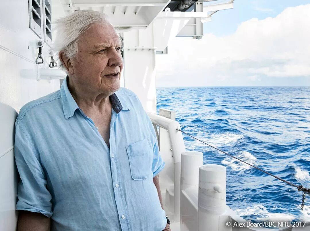 当壮阔的主题曲交响乐响起,一群飞旋海豚乘浪前行,91岁的大卫·爱登堡站在船头,穿的依旧是那件浅蓝色的短袖T恤,海风吹乱他花白的头发。