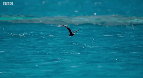 塞舌尔的海面平静,而突然一条珍鲹跃出捕食乌燕鸥,接着,更多的乌燕鸥被捕食,谢天谢地,最后,一只小燕鸥在父母的催促下,顺利逃开珍鲹的大嘴。