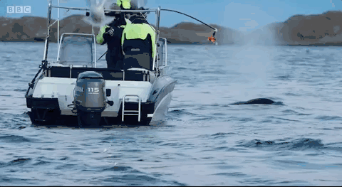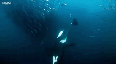 在挪威北部的峡湾,虎鲸将鲱鱼群赶往海岸的浅水区,然后它们用回旋踢的方式打晕鲱鱼,这样才顺利吃到鲱鱼。