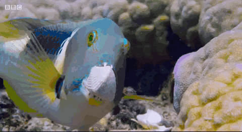 接着,讲的是一条猪齿鱼的日常:翻开珊瑚堆,吹开细沙,四处寻找它心爱的食物——一种蛤蜊。然后它总是游回由一种坚硬珊瑚围成的特定“厨房”,于是,蛤蜊被叼起,狠狠地被甩向珊瑚礁的特定位置,一次、两次……直到被蛤蜊外壳破碎,它得以美滋滋品尝美食。