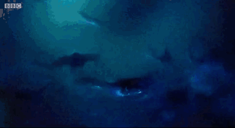 蝠鲼在墨西哥附近的科尔特斯海大量聚集、拍打翅膀,夜光藻在乌漆麻黑的水底下闪闪发光。这个场景简直就像施了魔法一样。当蝠鲼围绕摄像机盘旋觅食时,在它们身后留下一串璀璨的光亮。