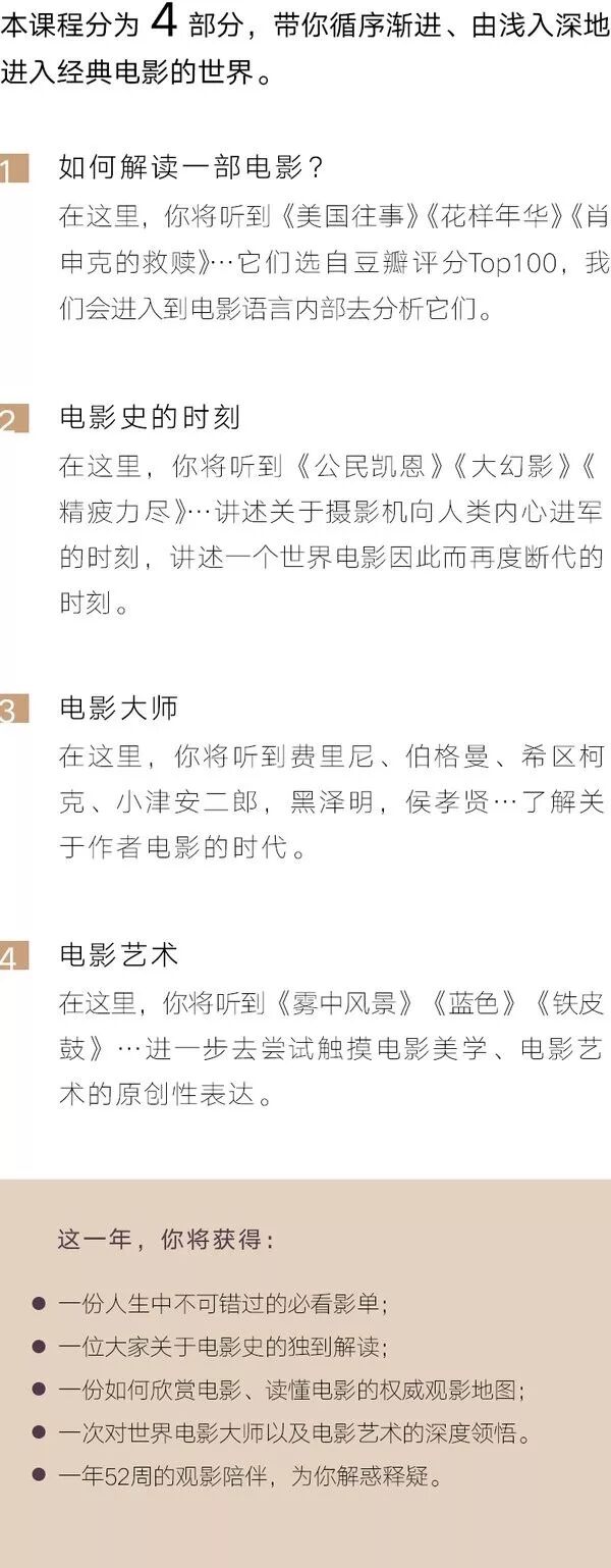 幸运的是,北京大学人文特聘教授,电影与文化研究中心主任戴锦华老师,在豆瓣时间推出了音频专栏《52倍人生——戴锦华大师电影课》,你将听到她用105期课程详细为你讲解如何阅读一部电影,你将得到一份一生不可错过的电影清单,你将听到她对52部享誉全球百看不厌的大师级电影详细的讲解和深度的领悟,而这些,只需要168元。